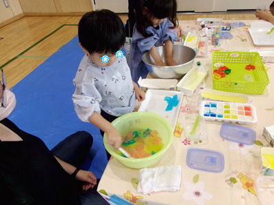 スーパーでアイスを買ったときにもらえるドライアイスを実際に触ったり、滑らせたり、水に入れて炭酸水にして飲んだりとたくさんの実験をしました。