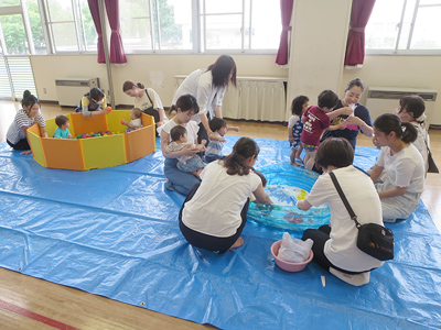 2024/07/12暑い夏、市民センターの和室に0歳から3歳の乳幼児親子9組が集まり縁日を楽しみました。