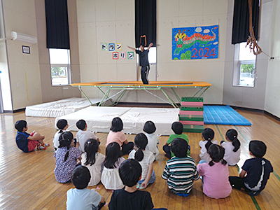 続いて児童センターの説明と乳幼児向け各行事の紹介を行い、大型絵本の読み聞かせなどを楽しんだ後、お待ちかねパラバルーンの登場です。音楽に合わせてバルーンが動き始めるとみんなわくわくした表情になりました。バルーンを上下させたり膨らんだ中にみんなで入ったりすると歓声が上がりました。