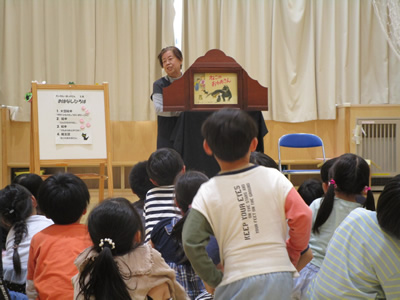 はじめに講師の榊井裕先生より、幼虫から蝶になる過程のスライドを見せてもらいました。児童館の近くで見つかる生きものについて学習した後は、実際に飼育ハウスの幼虫を見に行きました。