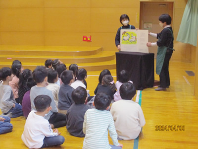 「三びきのヤギのがらがらどん」と「ふうたのはなまつり」の二話を真剣に聞く子どもたちの姿がとてもかわいく、時折りお話を聞きながら、賛同したり、応援したりする声も聞くことが出来ました。