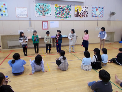今回は、けん玉の発表会を行って、みんなの前で自分ができる技を披露しました。1年生から順番に前に並んで、進行の掛け声とともに技に挑戦しました。上手にできる子や、失敗して何度も挑戦する子などみんな真剣です。上手にできたときは、ガッツポーズでアピールしたり、技ができた時などは、顔の表情がにやけてしまいみんなの笑いを誘ったりしていました。