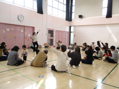 参加者と講師が近い距離で、次々と動いたり声を出したりテンポよく進んでいくと、初めは緊張してあまり動けなかった子どもも元気に動き出し、恥ずかしさからあまり声を出せなかった保護者もどんどん声を出し、活動そのものに引き込まれ、集中していく姿に変化していきました。参加者の年齢制限がなく、まだ歩けない赤ちゃんも参加していましたが、子ども達は一度も泣くことなく、みんな笑顔で最後まで楽しんでいました。