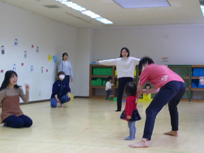 「はじめての豆まきごっこ」と題して、親子で豆まきの雰囲気を味わい、ちょっと早い節分行事を楽しみました。始めに手遊び「いとまき」をみんなで歌いながら鬼のウィッグを作り、赤ちゃんたちに着けてもらいました。かわいい小鬼ちゃんたちが「まめまき」の童謡に合わせて、毛糸のポンポン豆をまいていると…目の前に現れたのは、変幻自在のみどり鬼。伸び縮みする不思議な動きに怪訝そうな顔をしながらも、興味津々の赤ちゃんたちでした。