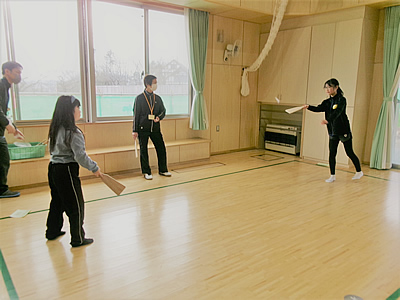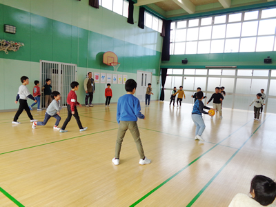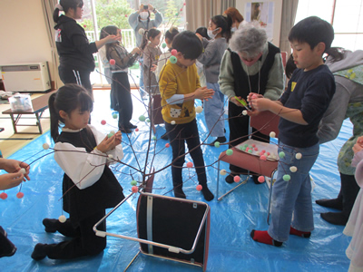 2024/01/13こま・けん玉・だるま落とし・羽根つきなど、お正月あそびや伝承あそびをみんなで楽しみました。栗生3丁目町内会の「くりさんクラブ」のみなさんが、お手玉やあやとり、福笑いで遊んでくれたり、栗生子育て支援クラブ「あいあい」のみなさんが温かいお汁粉をふるまってくれたりするコーナーもありました。