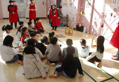 ぶんぶんゴマを作るコーナーでは、好きな絵を描いて、自分だけのぶんぶんゴマを作ることができました。コマはひゅんひゅんと音を立てて、みんな上手に回していました。他にも紙芝居やおみくじなどを楽しみました。新年早々、地域の方々に温かく見守られながら、楽しく過ごした一日となりました。