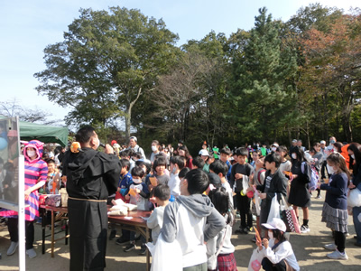 おばけたいじ、ハロウィンおやじ風呂、おばけDEヨーヨーすくい等、あそびのコーナーはどこも長い行列。工作コーナーのハロウィンキーホルダーや里山ネットの方々の弓矢や魚つりにもみんな夢中です。魔女の占いの館も大人気でした。エンディングのお楽しみくじ引きは沢山の方で盛り上がり笑顔のうちに無事終わりました。