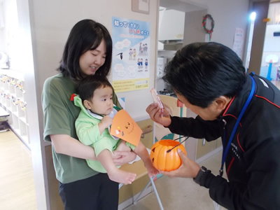 参加してくれたお子さんは二人とも初めてのハロウィンパーティーでした。ママと一緒に一緒に合言葉の練習をして準備オッケー!館内の職員に「トリック・オア・トリート」と合言葉を言うと、たくさんのお菓子をもらうことが出来ました。