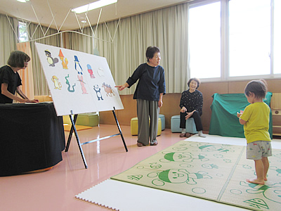 第4回の今回の目玉はパネルシアター「いろいろな帽子」でした。この帽子は誰のかなと問いかけるストーリーで、子どもたちはお話の世界に引き込まれ、目を輝かせて聞いていました。お母さんたちは「なかよし」さんの選んだお話を聞くことで、子どもの発想を豊かにすることや情操を養うのに役立っていると喜んでいました。