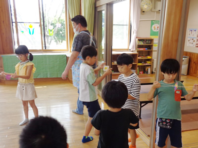 オープニングは、レクリエーションゲームの「猛獣狩りに行こうよ」。リズムに合わせて体を動かすうちに、中高生のお姉さんとの交流に緊張気味だった子どもたちの表情が晴れていきました。