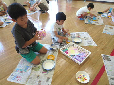 キットを予め用意して下さり、輪ゴムで固定したり、ボンドで接着したりしながら、組み立てていきました。輪ゴムを結ぶ所が難しかったようですが、優しく教えて頂いたお陰で、無事に全員が完成し、早く遊びたい様子でした。