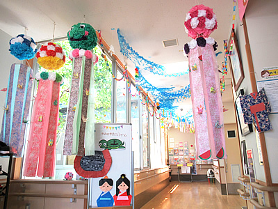 大きな天の川には、乳幼児さんから大人までのみんなの願い事が書かれた短冊がかかり、窓からの風にキラキラと揺られ、星に願いが届きそうな光景でした。