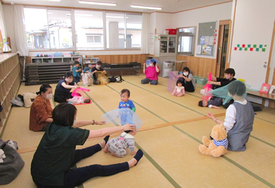 さわやかな晴天に恵まれた屋外でのしゃぼん玉遊びは、親子や子ども同士でどれだけ大きなしゃぼん玉を作ることができるか競うようにして楽しんでいる姿が印象的でした。