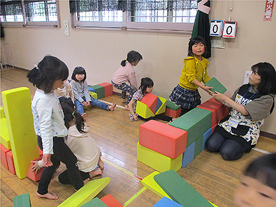 種芋の切り口に灰を擦り込んだら、児童館サポーターさんが作ってくれた畝に並べていきます。間隔をあけて並べていくと畑がすぐにいっぱいになってしまいました。