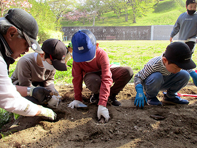 するとサポーターさんたちはすぐに隣のスペースを掘り起こして、畑2号を作ってくれました。そこにも種芋を並べた後に、みんなで優しく土を被せました。