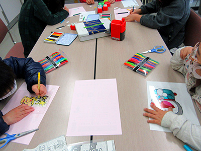プラバンに自分の好きな絵やキャラクターを描いてトースターで焼いたり、型抜きした花や星などを一つ一つ焼き上げ、組み合わせて貼り付けて、オリジナルのキーホルダーを作っていきます。細かい絵を写すことに夢中になり予定時間をオーバーした子も数名いました。トースターの中で小さくなっていくプラバンを見て、それぞれ歓声を上げながら大喜びする姿が見られました。