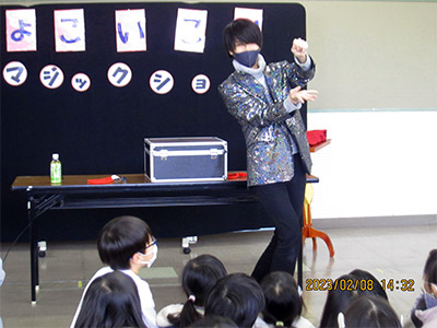 春が待ち遠しい2月のこの日。密を避けながらもなるべく沢山の小学生に参加してもらいたいと、児童館の遊戯室より広い川平小学校の視聴覚室をお借りして、マジックショーを開催しました。