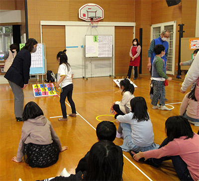 3年生がリーダーになりチームに分かれていよいよ対戦です。縦横3列ずつに並んだピンに一人5つずつの輪を投げ点数を競います。ねらいを定めてそっと投げると1年生でも高得点になったり、4年生でも通り過ぎてしまい点に繋がらなかったりと、誰でも力の差がなく戦えます。どのチームも接戦になりなかなか勝負がつかず、最後はリーダー同士の一騎打ち。皆に応援されながらがんばっていました。