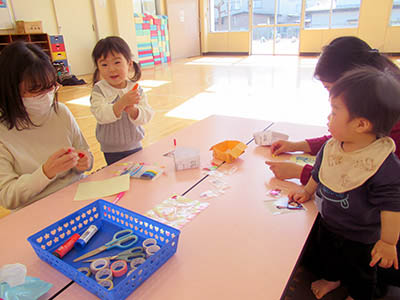 2023/02/16子育て支援クラブ、幸町地区民生委員児童委員の皆様と一緒に、「森の工作deおひなさま」を開催しました。
