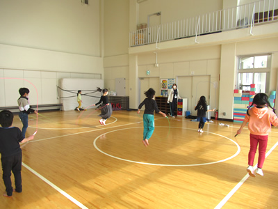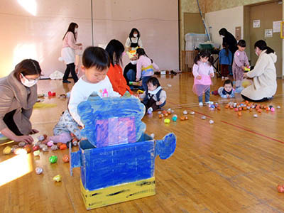 初めて見る鬼の姿に驚き泣き叫ぶ声が響く中、勇気を持った子ども達は勇敢に鬼に向かってボールを当てて戦いました。降参した鬼はあたふたと逃げていき、見事子ども達の勝利となりました。