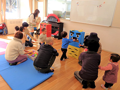 2023/02/03「鬼のパンツ」「豆まき」の歌で始まった豆まき会。振付で踊りながらウォーミングアップをした後は「鬼は外、福は内」の掛け声を練習していざ本番!