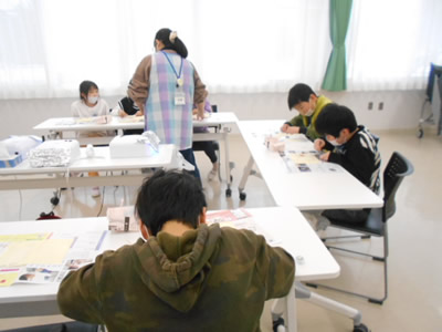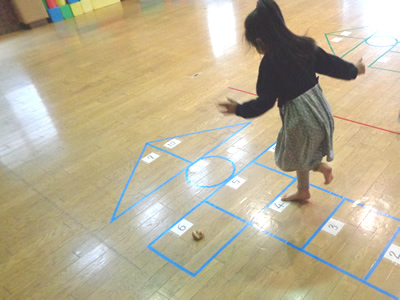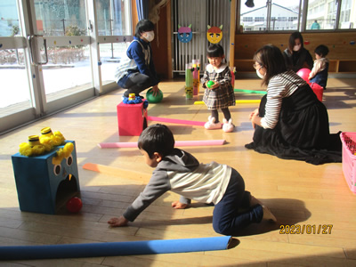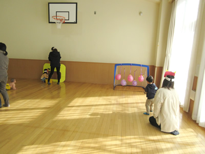 その後は鬼退治コーナーです。鬼の口にボールを入れる鬼さんコロコロコーナー、鬼さんボーリングコーナー、豆まきポシェット作りコーナー、鬼さん玉入れコーナーを親子で自由にまわって楽しみました。特に、鬼さんコロコロコーナーは人気で沢山のボールが鬼さんの口に入りました。