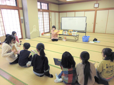 体操や手あそびをした後に「せつぶんシアター」を見ました。ねこさんといぬ君のお腹に鬼が入りこみ、泣き虫ねこさんや怒りんぼいぬ君に変身してしまいます。でもみんなの「鬼は外!福は内!」の掛け声パワーで鬼さんを退治して、めでたしめでたし。最後まで1歳児のお友だちも集中して見ていました。
