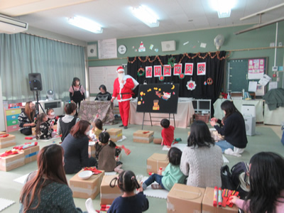 さて、今回は「クリスマス会」をテーマにして行いました。クリスマスにちなんだ簡単な工作をしたり、ピアノの伴奏に合わせたパネルシアターではマラカスを鳴らして参加したりと、皆さん楽しんでくれている様子が伺えました。