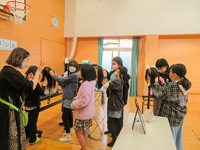 小学校の校庭で、最初はおもいっきり走って凧をあげようとする子供たちの姿が見られました。その後、会の皆さんにコツを教えてもらうと、走らなくても巻き糸を全部伸ばすほどに空高くあげられるようになりました。