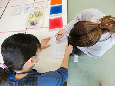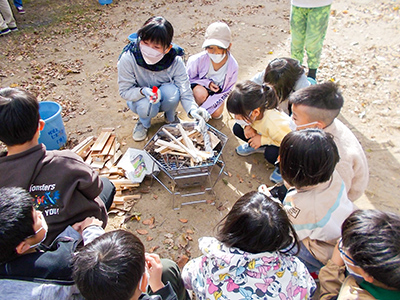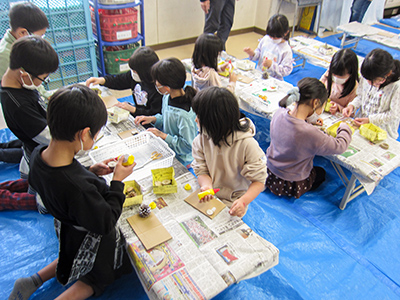 校庭でひろったドングリやとちのみ、小枝を輪切りにしたものなど、みんなでせっせと集めたものをきれいに分類して箱にいれるとなんだかとっても特別な素材になって、子ども達がキラキラと目を輝かせながら材料選びを始めました。ちょっとずつ違う材料の中から「これ!」と思うものを選んで台紙に貼ったり、材料同士を組み合わせたり工夫しながら、それぞれがとても素敵な作品に仕上げることができました。