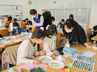 続いてお楽しみランチタイム♪全員で石製の大きなテーブルを囲みます。「顔を見ながら食べると美味しいね!」と子ども達。1年ぶりの遠足が楽しくて楽しくて、笑いが止まりません。