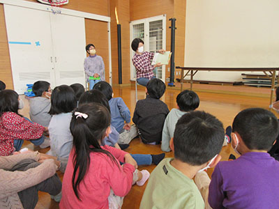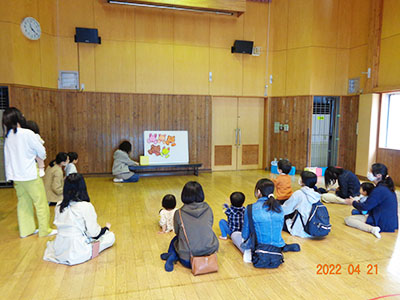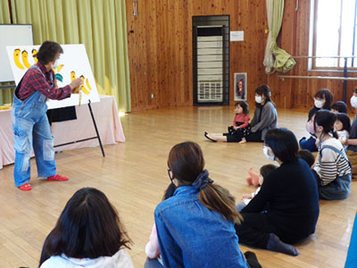 お子さんたちは、初めてなのに、にこにこ笑顔で体操をしたり、パネルシアターの質問に答えたり、