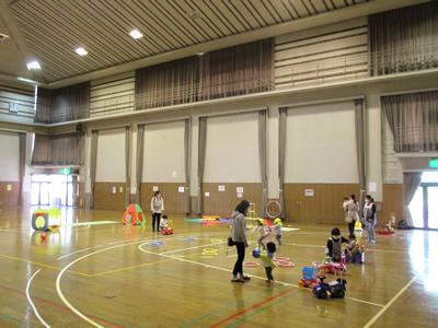 片平市民センターの体育館をお借りして、トランポリンや車の乗り物、ボール、ミニジャングルジム等を用意しています。