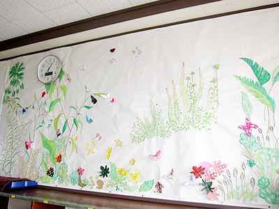 みんなの児童館を彩る壁面が新しくなりました。きれいな草原の様子にみんな目を奪われてしまいます。