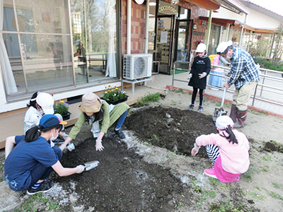 児童クラブから希望者を募り「春の花壇づくり」に取り組みました。
