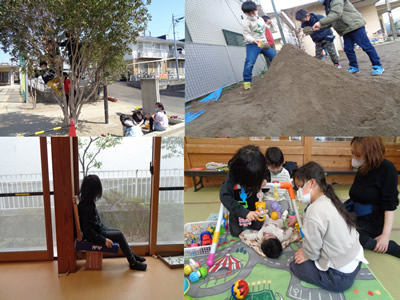 風を受けて回った時にどんな模様に見えるか想像し、ワクワクしながら書いていきます。最後に職員にボンドで止めてもらい、すぐにでも回したい気持ちを、ボンドが乾くまでの間しばらく我慢。その後、「回ったよー」とにこにこ笑顔で遊んでいる姿をたくさん見ることができました。