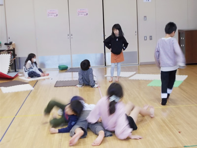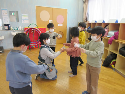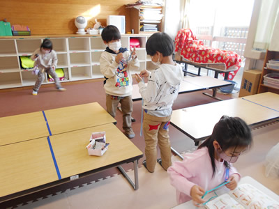 「おばあちゃんが教えてくれるの。おばあちゃんはとっても折り紙が上手なんだよ!」と誇らし気な女の子。何度も折り返して、ハサミを使わずに紙を上手に切る姿に伝え合いの素晴らしさを感じます。