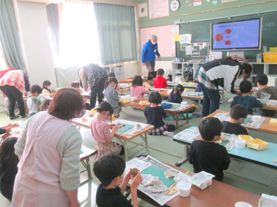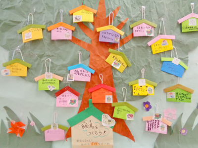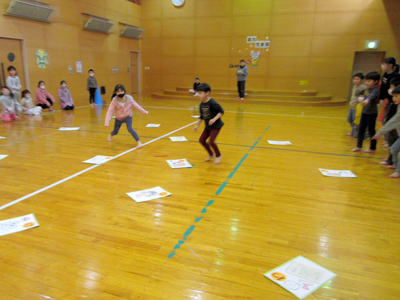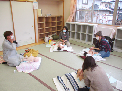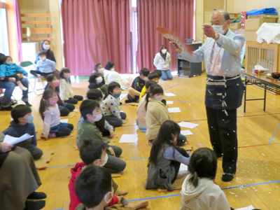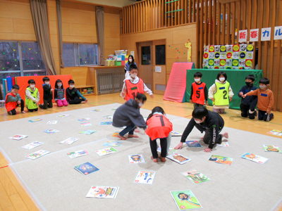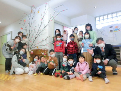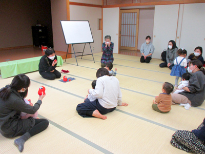 2022/01/11毎月人気の木のこのお部屋がスペシャルで登場しました。あけましておめでとうのご挨拶から始まり、竹丸さんと林さんの息の合った進行で会が進みます。わらべ歌のふれあい遊びではいつもよりゆっくり時間をとり、じっくりと親子の触れ合いを楽しみました。一人ずつ名前を聞いて歌の中に当てはめて呼んでもらうと、かわいいお返事の声が聞こえ、その声に拍手が起こりみんなが笑顔になりました。紙芝居や絵本・手作りのお人形を使っての歌遊びなど盛りだくさんで、楽しさに引き寄せられて前にでてくる子も多くいました。合間には竹丸さんの「こんな時この歌遊びをやってあげるといいよ」とアドバイスがあって、楽しくて参考になるあっという間の45分でした。