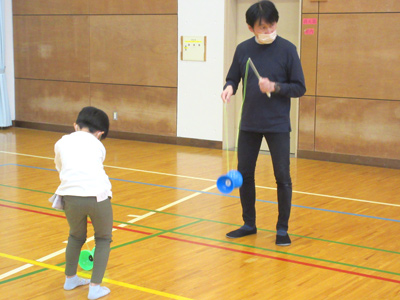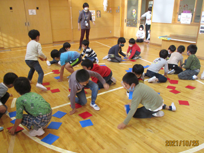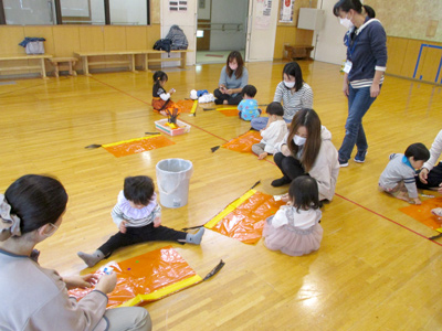 参加してくれたので、何に変身してきたかインタビュー。ドキドキしながらも皆に衣装を見せて答えてくれていました。おばけやカボチャの出てくるお話を見た後に、カボチャの形のお菓子入れを作りました。お母さんと一緒に協力して紙コップにオレンジの画用紙をつけて、仕上げに壁に飾っているカボチャの顔を持って来てペタンと貼って完成!最後に魔法の言葉を覚えて、お菓子集めゲームに出発♪児童館の中をお菓子を持った職員を探して「トリックアトリート‼」お菓子でいっぱいになった、カボチャのカゴをみんな笑顔で見せてくれました。ハロウィンの雰囲気をみんなで楽しめたすくすくタイムでした。