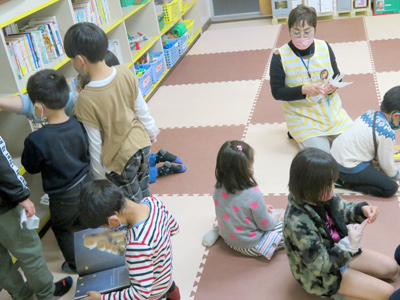 子どもたちが遊戯室に入場すると、ぼたもち堂のみとちゃん、クラウンくみちゃんがパフォーマンスでお出迎えしてくれました。子どもたちはあっという間に目が釘付けとなり、次々に披露されるスゴ技に歓声をあげたり拍手をしたりしていました。一番盛り上がった演目は、みとちゃんによるバランス芸です。子どもたちにお馴染みの竹馬や大きな脚立をみとちゃんが見事顎に乗せると、子どもたちからは大きな歓声が上がりました。ジャグリングの面白さに触れることのできた一日でした。