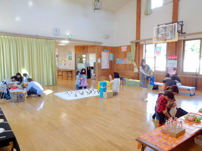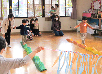 遊戯室に広がるカラフルな万国旗を見て歓声をあげる幼児親子のみなさん。2チームに分かれ「かけっこ」「障害物競争」「パラバルーンを使った親子競技」の3種目を行いました。「よーいどん!」のスタートの合図と共に駆けてゆく子どもたち。「できたよ~」と満面の笑みでゴールから戻ってくる姿もほほえましく、終始我が子の成長した姿を見守るお母さんたちの温かな雰囲気に包まれたうんどう会になりました。最後に、一人ひとり名前を呼ばれ、キャンディーレイのメダル贈呈と沢山の拍手をもらった子どもたちは、少し恥ずかしそうにしながらも自信に満ちたいい笑顔でした。