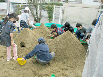他にも1年生から4年生まで一緒になってドッジボールをしたり、【逃走中】を楽しんだり、砂場で大きなトンネルを掘ったりと、外での遊びは無限に広がっています。