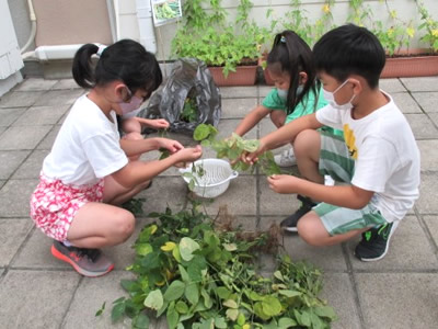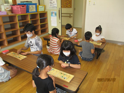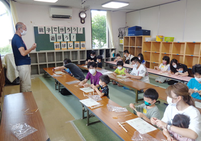 2021/08/11広い体育館に集まった子どもたちは、配られた新聞紙に興味津々でした。説明を聞きながら折り進めると、まるで海賊が被るような帽子となり、大きな船へと姿を変えていきました。折り方が分からない子のまわりには、教えてあげようとする子が集まり、一体感も高まっていました。「みんなで宝船を見つけに行こう」という掛け声で、大きな船を持ち、ついに新聞紙の大海原へと近づきます。ところがここで嵐に襲われ、船が破損するという展開となりました。開いてみると…なんとライフジャケットに早変わりしていてもう安心…そのまま歓声をあげて海へととび込んでいきました。豊かなストーリー性を持った遊びは、夏休みの楽しい思い出になりました。
