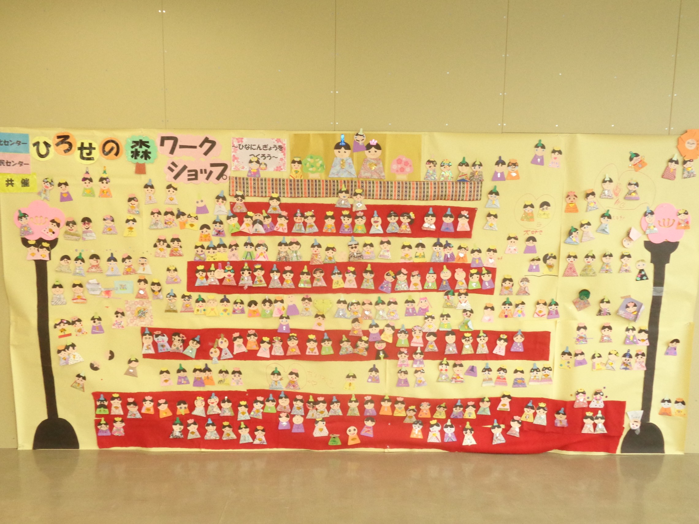 今回は2月17日から3月3日の間、「ひろせの森ワークショップ~ひなにんぎょうをつくろう~」と題し、1階ロビーに工作・展示コーナーを設置しました。