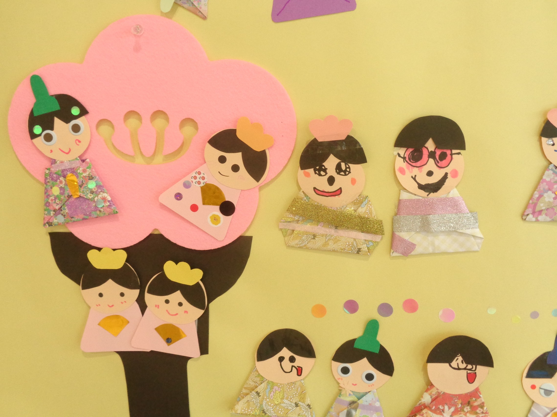 来館された方々が、型紙と折り紙でおびなとめびなを作り、ひな壇をイメージした壁面に飾ってくださいました。