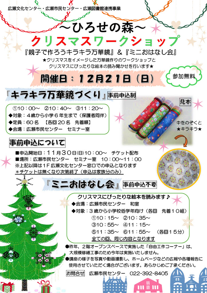 12月21日(日)に、広瀬文化センター併設の広瀬市民センター・広瀬図書館と連携し「~ひろせの森~クリスマスワークショップ『親子で作ろうキラキラ万華鏡』&『ミニおはなし会』」を開催します。