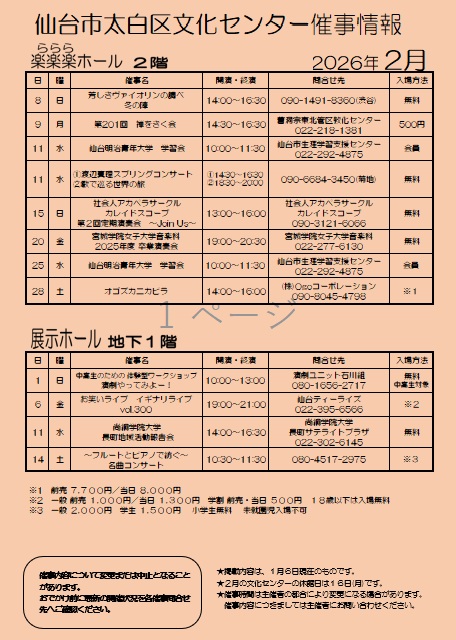 太白区文化センター2月の催事情報(1月6日現在)をお知らせいたします。