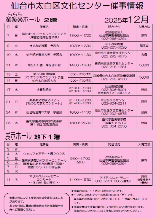 太白区文化センター12月の催事情報(11月3日現在)をお知らせいたします。