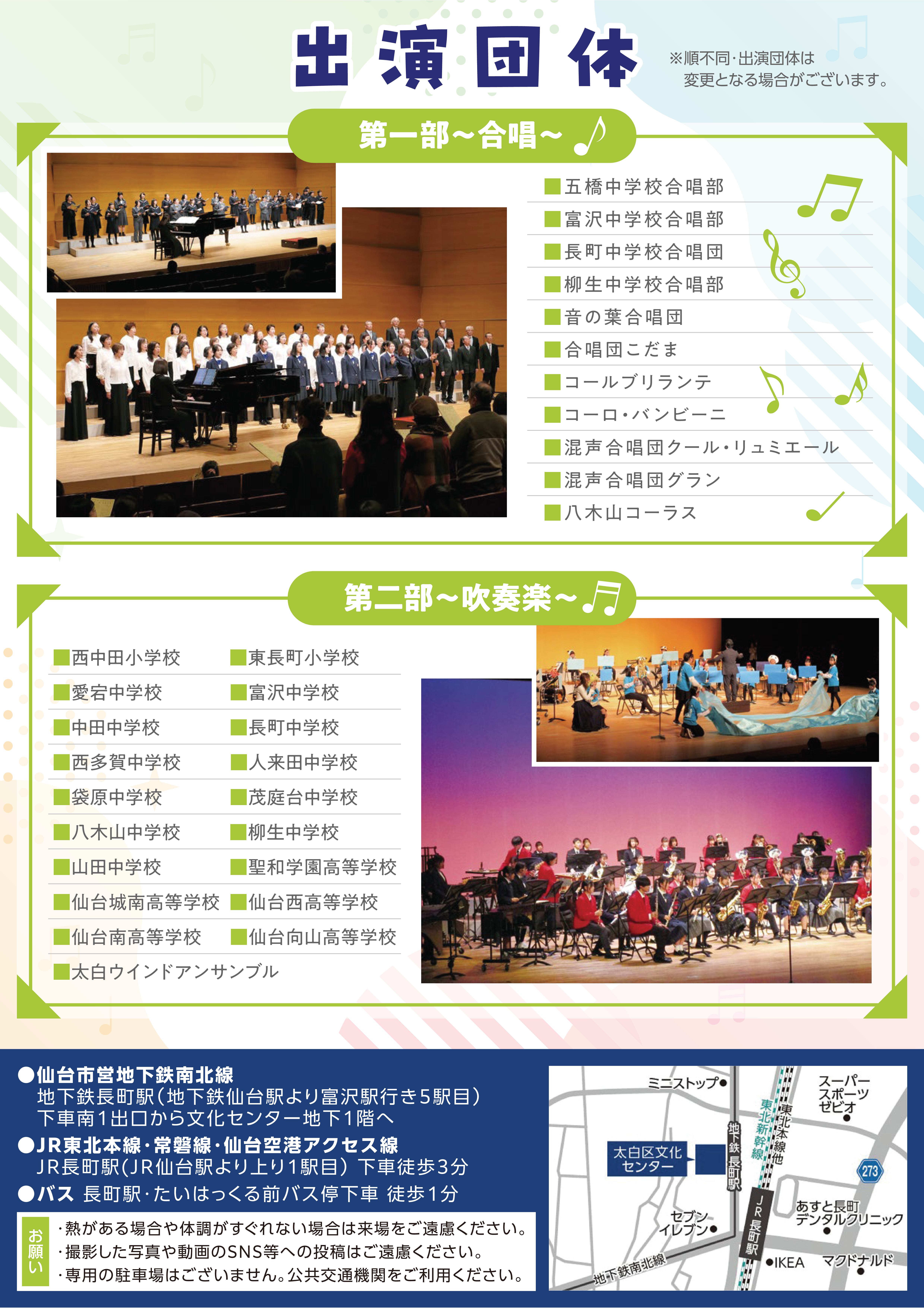 太白区内に加え、宮城県内で活躍している、選りすぐりの合唱団体、吹奏楽の学校・サークル団体が登場!