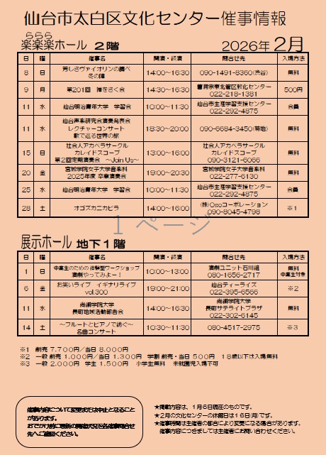 太白区文化センター2月の催事情報(1月6日現在)をお知らせいたします。